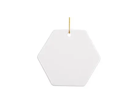 | Item Name: 3" Hexagon Ceramic Ornament Item No.: H031 Material: Ceramic, with gold string Net weight: 30g Size: 6.8*7.6*0.4cm Personalized by JTrans® Smart Sublimation Oven or Vacuum Heat Press  |